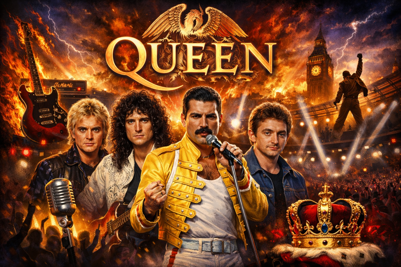 Queen, een Britse rockgroep, combineerde innovatieve muziek met de aparte stijl van Freddie Mercury en een onmiskenbaar geluid dat het tijdperk van de jaren zeventig en tachtig definieerde. Hun historische optreden op Live Aid in 1985 werd een legendarisch moment en verenigde miljoenen mensen over de hele wereld met hun energie en passie voor muziek. Tot de bekende hits van de groep behoren bijvoorbeeld Bohemian Rhapsody of We Are The Champions.